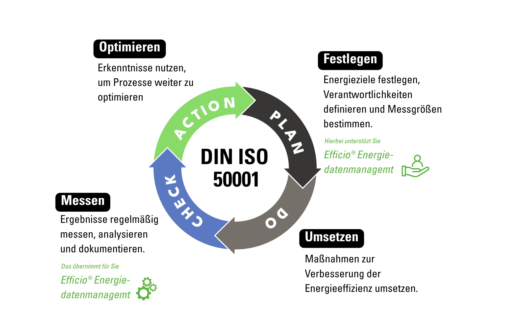 Zur systematischen Auswertung der Messdaten braucht es eine Softwarelösung, die Analyse, Visualisierung und Berichterstattung automatisiert. Mit Efficio® steht Unternehmen ein webbasiertes Energiemanagementsystem zur Verfügung, das alle Anforderungen der ISO 50001 erfüllt, inklusive Alarmfunktionen, Energiekennzahlen und Reporting-Funktionen.