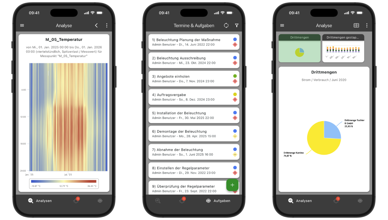 Sie messen, erfassen, analysieren und optimieren alle Energieflüsse in Ihrem Unternehmen, um kontinuierlich einzusparen. Mit unserer webbasierten Softwarelösung können ganze Energieteams von mehreren Standorten jederzeit auf alles zugreifen. Unsere Mandantenfähigkeit lässt frei konfigurierbare, individuelle Dashboards zu, in denen Aufgaben und Termine übersichtlich dokumentiert sind. Über ein automatisches Berichtswesen bleiben alle Beteiligten in Fertigung und Controlling stets informiert.